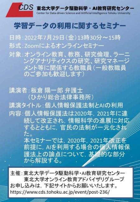 対象:本学オンライン教育アドバイザリグループ,教務関係者,入試関係者,各部局研究倫理委員会関係者,情報科学研究科ラーニングアナリティクス研究センター関係者,データ駆動科学・AI教育研究センター関係者,高度教養教育・学生支援機構関係者,教育学研究科関係者,(一般の教職員も参加可能です)